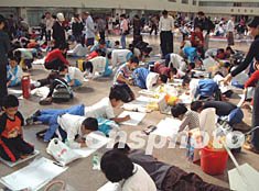 迎接“十六大”现场中小学生书法比赛在珠海举行,共有五百名中、小学生参加。作者:石头