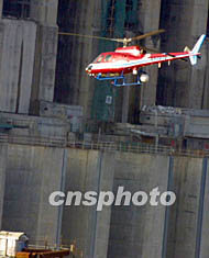 中央电视台三日用直升飞机拍摄长江三峡大坝导流明渠截流施工现场。随着合龙日期的临近,目前新闻单位在这一区域已形成了水陆空立体报道网。作者:宋吉河