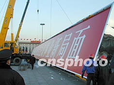 中共“十六大”即将召开,北京天安门广场日前将巨型灯箱标语牌吊装完成。