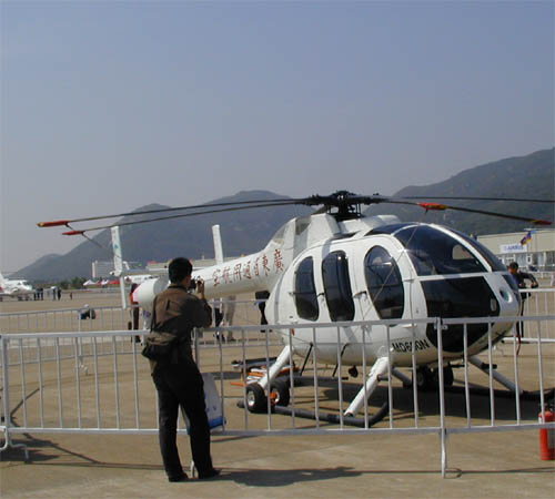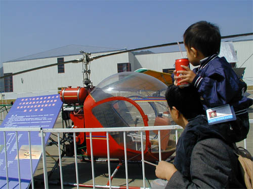 前来参观航展的父子俩,驻足于一架超轻型直升机