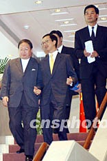 香港政府行政会议11月5日召开会议,讨论通过了备受关注的公立医院急症室收费100元建议。图为会后民政事务局长何志平、财政司司长梁锦松、行政会议成员梁振英等步出会场。 洪少葵 摄