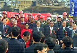 截流仪式结束后,中央领导一行离开主席台,走到上游围堰,接见三峡建设者并与建设者代表合影。