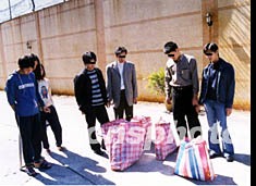 一个在深圳沙头角某住宅楼利用鱼枪发射钢丝在深港两地搭起一条走私手机的“空中运输线”、企图大肆走私手机的犯罪团伙,六日被深圳海关缉私警察全部抓获,缴获走私进口手机一百六十三部、手机电池九十六个、耳机一千二百个。图为被抓获的走私分子。作者:张曹