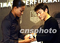 美国的“世界女飞人”琼斯,11月7日在香港代表世界名表TAG Heuer公司向香港歌坛天王刘德华赠送TAG Heuer Link C36自动计时表。刘德华是全世界第二个获得该款表的人士,第一个获得者是世界高尔夫球王泰戈.伍兹。任晨鸣 摄