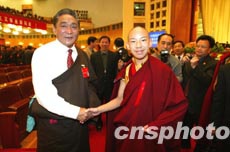 出席中国共产党第十六次全国代表大会的热地代表(左),八日在北京人民大会堂向特邀参加会议的十一世班禅额尔德尼.确吉杰布问候致意。作者:毛建军