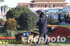 中共十六大十一月八日在北京人民大会堂召开,北京警方出动警犬在天安门广场进行安全检查。作者:满会乔