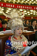 来自贵州少数民族地区的党员代表身着独特的银饰,盛装出席中共十六大。作者:毛建军