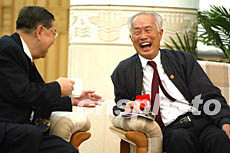 图:林若与郭荣昌在中共十六大分组会上交谈