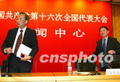 在北京召开的中共十六大十日举行中外记者招待会,国家发展计划委员会主任曾培炎(左)和国家经贸委主任李荣融成为新闻人物。作者:毛建军