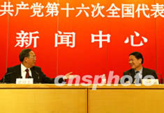 中国国家发展计划委员会主任曾培炎(左)和国家经贸委主任李荣融十日成为中共十六大新闻中心举行的记者招待会新闻人物。作者:毛建军