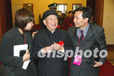 福建代表伍洪祥十日在工作人员的陪伴下参加中国共产党第十六次全国代表大会分组会。八十八岁的伍洪祥曾作为代表出席过中共七大。作者:毛建军