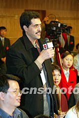 卡塔尔半岛电视台记者在新闻发布会上提问 毛建军 摄