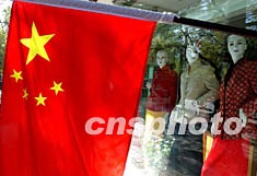 十一月的北京街头为中共十六大召开遍挂国旗,红光映照着时装店的模特。作者:贾国荣