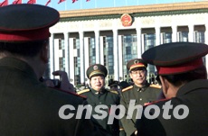 分别来自解放军和武警部队的两名将军代表,在北京人民大会堂前合影留念,他们共同出席在此间召开的中共十六大。作者:满会乔