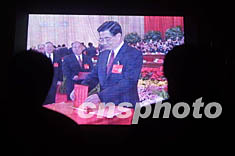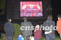 十四日晚,北京市民冒着寒风在北京火车站广场观看胡锦涛在中共十六大上投票的电视新闻。作者:史利