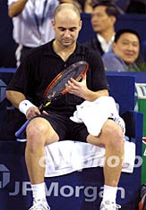 阿加西在上海结束了十四日的比赛之后,正式宣布因伤退出本届余下的比赛。图为阿加西因伤在场边休息。作者:汤彦俊