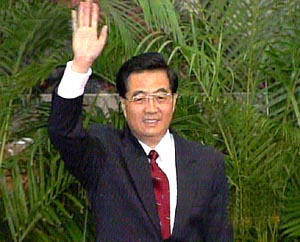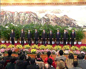 上午十一点半,中共中央总书记胡锦涛在人民大会堂向中外记者一一介绍了各位常委。随后,胡锦涛发表了讲话。