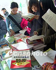 北京众多青年人在书店选购有关公务员知识的书籍,准备参加十二月进行的国家公务员考试。在竞争激烈的现代中国,拥有稳定收入的公务员职位越来越受到年青人的青睐。作者:王丽南