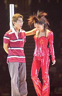 那名嚼着口香糖上台的男歌迷,被阿妹两名女舞蹈员“点中”上台后,双手就被绑在舞台中间的一根柱子上,面对一身红艳艳贴身衣裤装的阿妹“诱惑”,男歌迷的“定力”似乎是太好了,反而是台下的观众,不知是羡慕男歌迷,还是被阿妹的性感挑逗给“刺激”得不停高喊和尖叫。