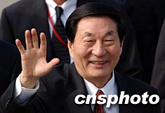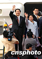 中国国务院总理朱镕基和夫人劳安圆满结束在香港的各项行程,今天下午乘专机离港返京。中新社图 潘索菲 摄