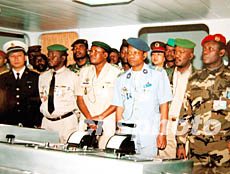 国防大学外训系高级指挥班三十四名外籍军官二十一日访问广州舰艇学院。图为外籍军官在该院副院长李宁将军陪同下参观舰艇教学模拟训练中心。作者:庹新国