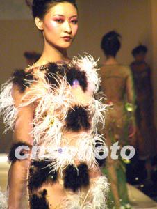 新古典主义·璞玉.甘晓川2003春夏时装发布会,二十四日晚在北京中国大饭店举行,其服装设计融合古今,体现出大胆前卫的设计理念。图为一款色彩艳丽的透视装。作者:盛佳鹏
