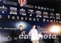 由中国互联网协会主办的国内首届“电玩”大赛二十四日晚落下帷幕。一些把电子游戏玩得出神入化的国内高手纷纷亮相,角逐FIFA2002、星际争霸、反恐精英等各个奖项的冠军。图为来自广东的林晓刚获得电子游戏FIFA2002的冠军。作者:姜煜