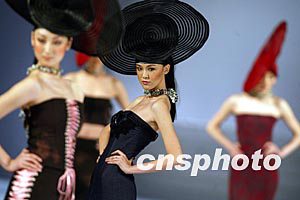 香港设计师邓达智时装发布会二十三日在北京中国国际时装周上亮相。其设计的古谷惠品牌作品面料考究、做工精细。图为模特身着简洁明快的晚礼服显得分外妖娆。 作者:毛建军