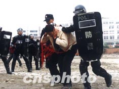 26日,成都首次反恐怖演习。图为在A国驻蓉办事处门前参与闹事者,在准备逃跑时被民警用高科技装备“网枪”网住。作者:刘真