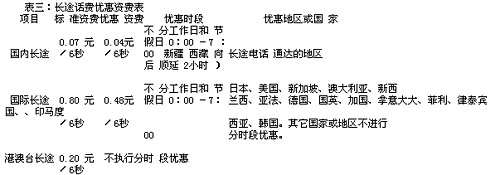 后付费用户打国内和国际长途电话的话费享受分时段优惠,具体长途资费标准见表三。