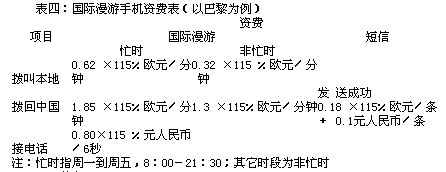 开通国际漫游并能在当地使用的手机,具体资费标准要根据当地话费标准而定。例如在法国巴黎使用漫游过去的GSM手机,就有三家服务运营商提供服务,具体的资费略有差别,但一个国家和地区服务提供商的资费水平和标准差别不大,通常我们的手机用户到当地会自动进入某个运营商的服务网络。巴黎的资费一般分忙时和非忙时,具体资费见表四。