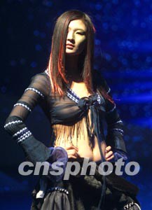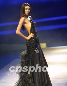 二十八日晚,著名时装设计师张肇达在北京天桥剧场举行的时装发布会上,展示了他设计的黑色配有白色花边的时装,充满浪漫色彩,赋予狂野豪放的格调。作者:史利