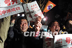 三日晚,在摩纳哥梦特卡洛举行的国际展览局第132次会议上,中国上海通过激烈竟争获得2010年世界博览会主办权,当中国申博成功的喜讯从蒙特卡洛传来的时候,上海全城沉浸在一片欢乐之中。图为申城市民在为中国申博成功欢呼。作者:汤彦俊