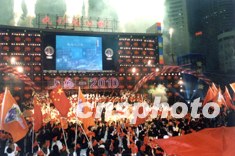 当上海以绝对优势获得二○一○年世界博览会主办权的消息传来,上海南京路世纪广场顿时成了欢乐的海洋。四面八方聚集而来的上海市民,挥舞着手中印有世博会徽标的各色旗帜和国旗,尽情地欢呼。作者:姜煜