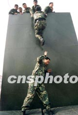 解放军总参一支野战通信部队,日前进行攀登高墙训练。这项训练科目要求,十名战斗员要在一分钟内完成四米高墙的翻越。作者:马新刚