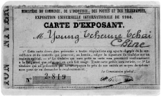 这张编号为2819的参展证正面,是顾永保的照片,还印有1900的字样;背面上端的法文是:“贸易部、工业部、邮电通讯部1900年国际全球展览”;参展者名字处是“永珍斋”的拼音,另起一行是法文“中国”,再下面则是三条参展的规定。
