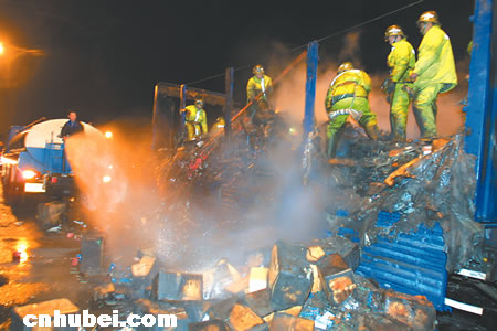 中新网12月8日电 据楚天都市报报道,7日晚10点半左右,一辆满载鞭炮的加长货车,驶至京珠高速公路军山长江大桥中段时,突然起火爆炸,车上4人跳车逃生。