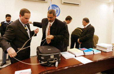 伊拉克政府7日向在伊拉克的联合国武器核查小组负责人递交了有关伊拉克大规模杀伤性武器研制情况的报告。这份报告将用联合国专机运送到位于纽约的联合国总部和位于维也纳的国际原子能机构。图为伊拉克官员捆绑递交联合国的武器核文件。