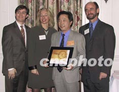中国基因研究专家杨焕明(左三)及其研究小组今年四月在《科学》杂志发表《水稻基因组工作框架图》,在世界上首次将完整的水稻基因组草图序列向公共数据库公开。杨焕明因此被《科学美国人》被评为年度科研领袖人物,十日在纽约接受颁奖。作者:赵海燕