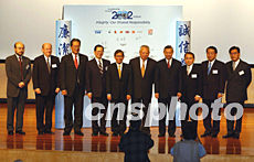 董建华与香港商政领袖签署诚信协议。二零零二年领导论坛“商政领袖面对的诚信挑战”十二月十二日在香港举行,香港特区行政长官董建华(右五)、公务员事务局局长王永平(左五)及廉政专员李少光(右四)等在该论坛上签署诚信协议。潘索菲 摄