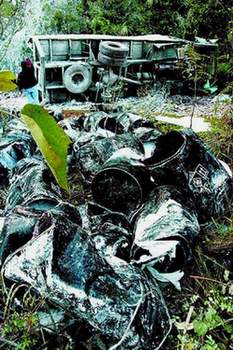 前天1时50分,一辆车牌号为桂GA1416的解放牌平头大货车在金秀瑶族自治县七建乡至三角乡途中翻下约60米高的山坡,滑下金秀河道。车上载着的100桶共20吨三氧化二砷(俗称砒霜),有33桶跌入河道,其中30桶不同程度破损,少量砒霜散落河水中,其余67桶翻在山坡上。目前,此事已经上报中央和国务院,中央政治局常委、国务院副总理吴邦国要求迅速妥善处理好此事。