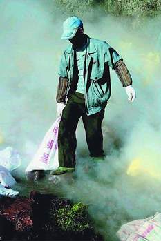 民工洒石灰稀释河水。(《南国早报》供图)