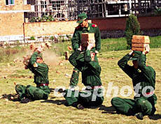 福建连江县公安、边防、消防、内卫、巡警、交警以及警犬队等各警种的百余名选手十二月中旬举行反恐技能竞赛。图为连江边防大队官兵展示硬气功技能。作者:卞郑