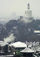十五日,北京遭遇今冬第一场雪,北京著名旅游景点北海白塔在白雪的映衬下分外漂亮。作者:盛佳鹏