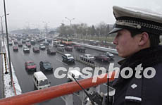 十五日,北京遭遇今冬第一场雪。为防止出现类似去年“一二·七”交通大拥堵的情况,北京交警在重点路段加强巡逻。作者:张炜