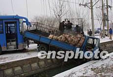 十五日,北京迎来了今冬第一场雪。在朝阳区金盏乡路口,由于路面湿滑,一辆载猪卡车撞向路边深沟,幸好没有人员伤亡。作者:赵振清