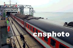 12月15日6时35分,随着“粤海铁一号”缓缓停靠位于海南海口的粤海铁路南港码头,中国第一列跨海旅客列车成功横渡琼洲海峡。联合调试组测试后表明各项安全指标达到设计要求。图为旅客列车在北港码头驶进“粤海铁一号”船舱时的情景。古月 摄