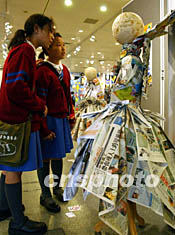 香港学童用旧报纸制作的时装新近在中央图书馆展出,这种新颖的“环保时装”吸引不少参观者。潘索菲 摄