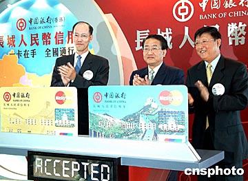 中银香港总裁刘金宝博士、副总裁林炎南及中银卡(国际)有限公司总经理苏诚信,12月17日主持仪式,推介香港发行的首张人民币信用卡。洪少葵 摄