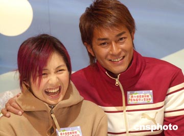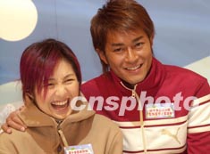 当古天乐搭着杨千桦之肩膊合照时,千桦情不自禁展露灿烂笑容。